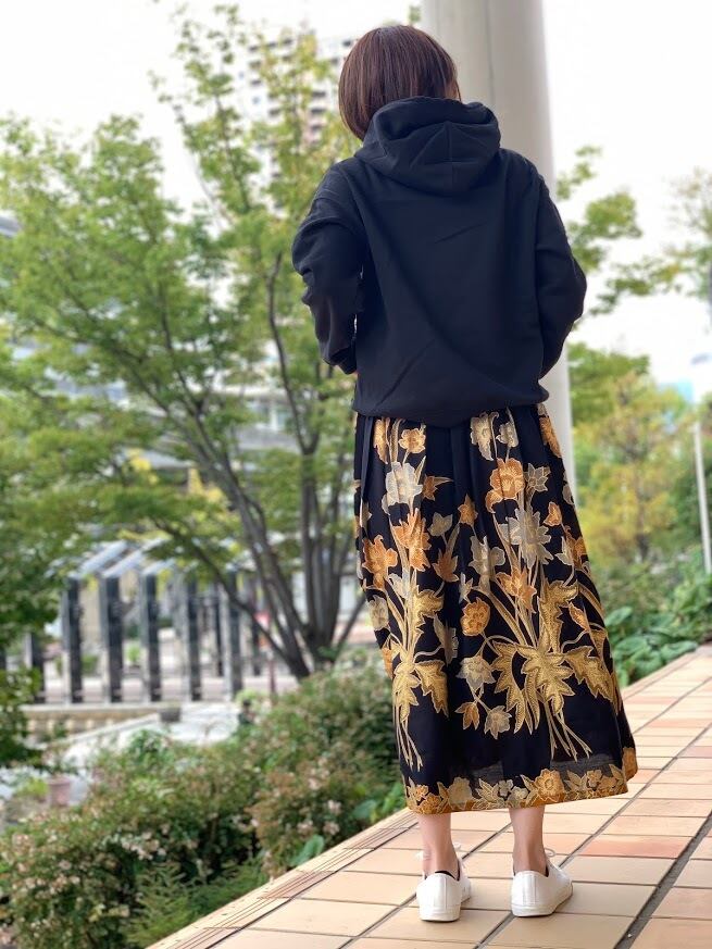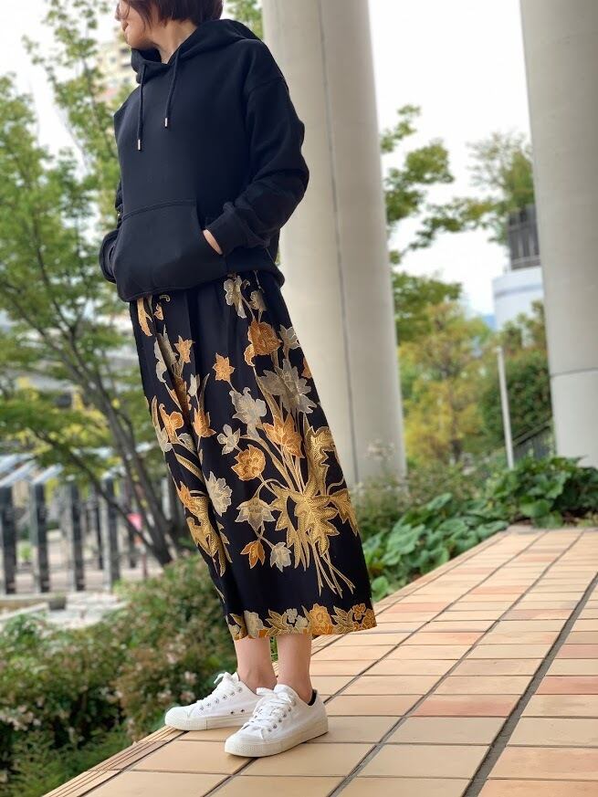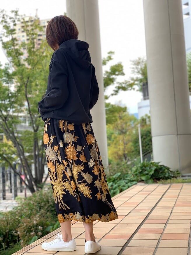 合わせるトップスや小物次第で、華やかさが出るスタイルが魅力です。