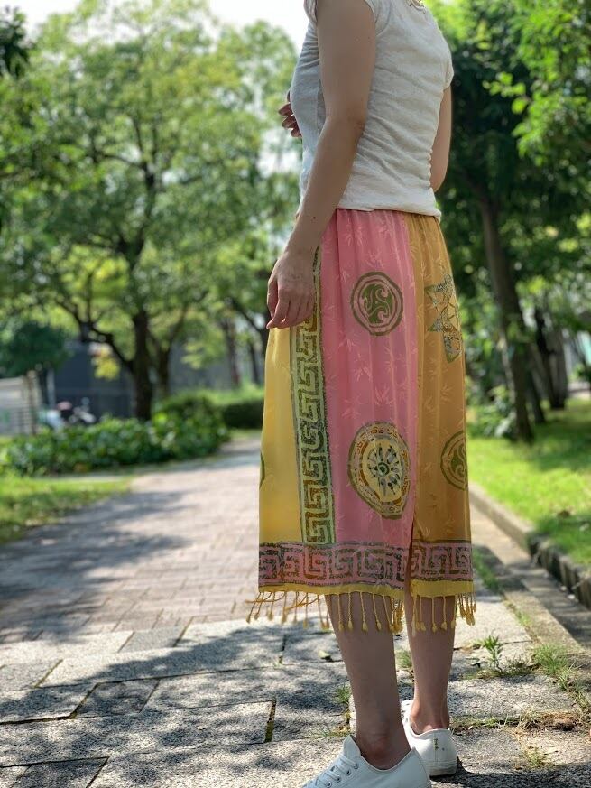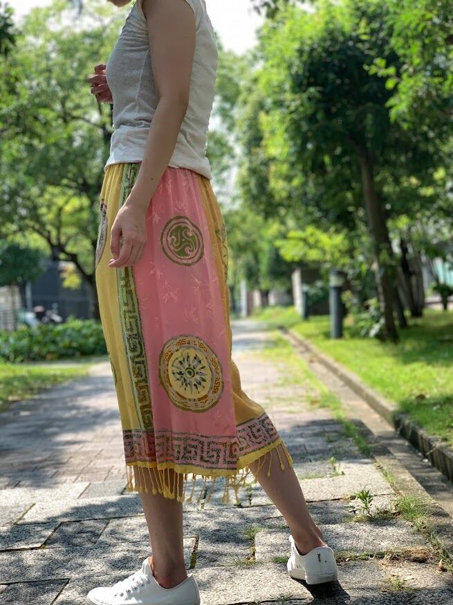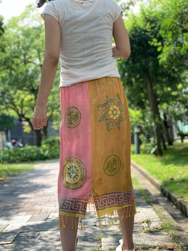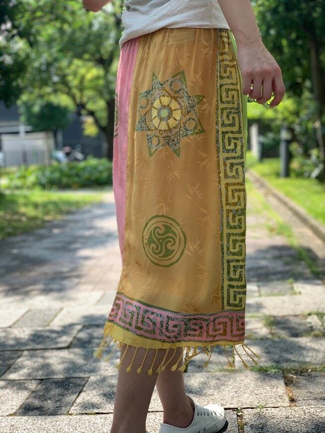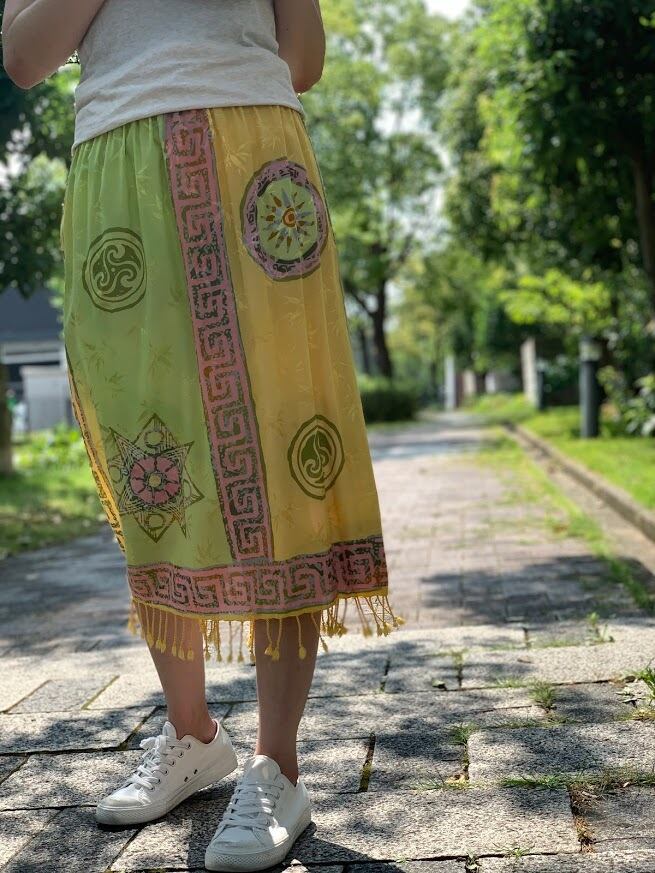 手書きと型押しのろうけつ染めで作られた、ジャワ更紗スカート。