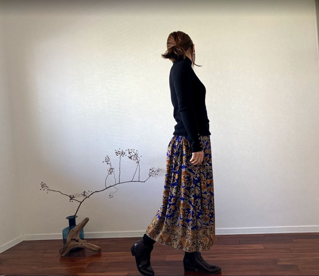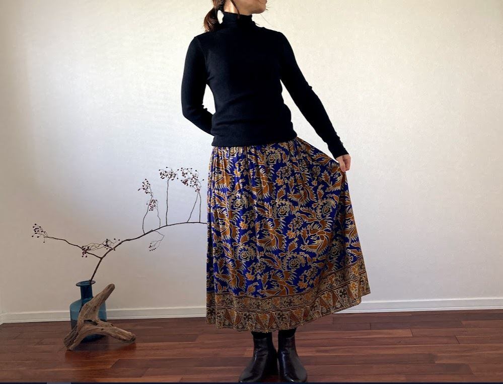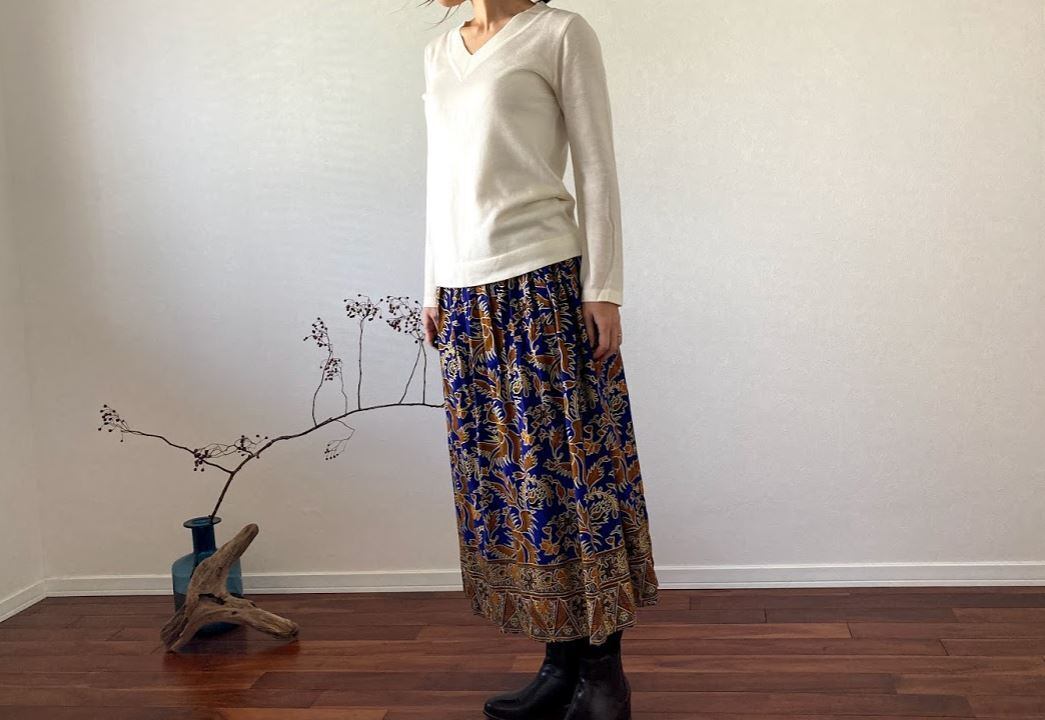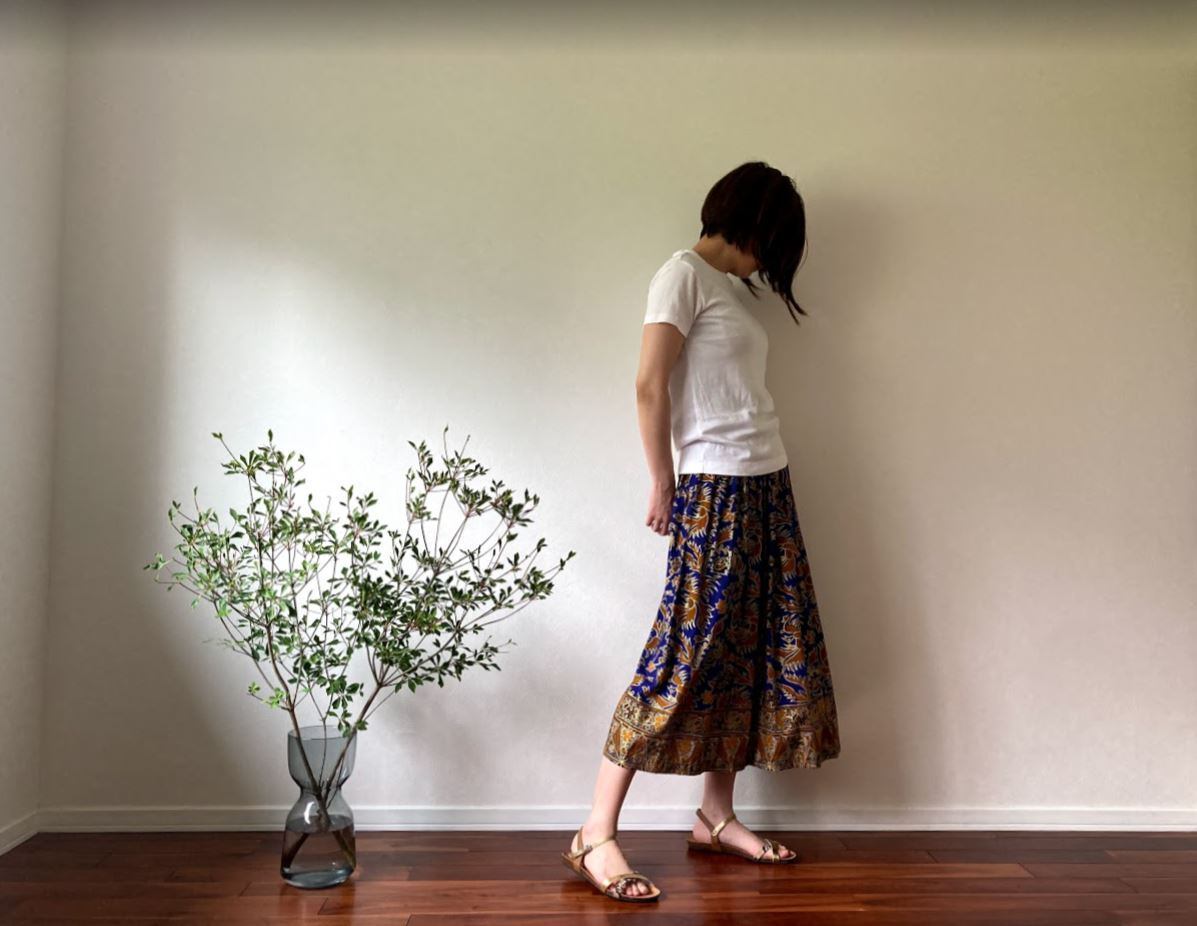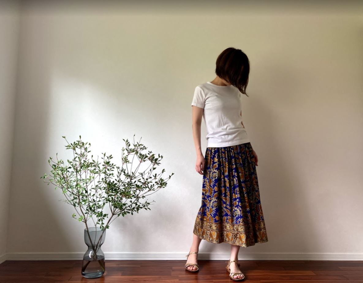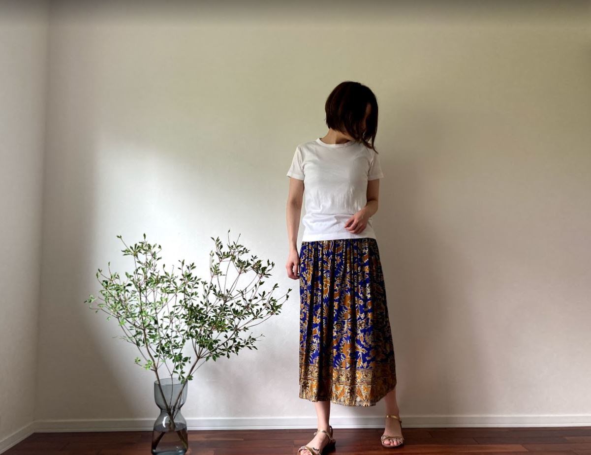 無地のトップスと合わせると、スカートの鮮やかな柄と色が