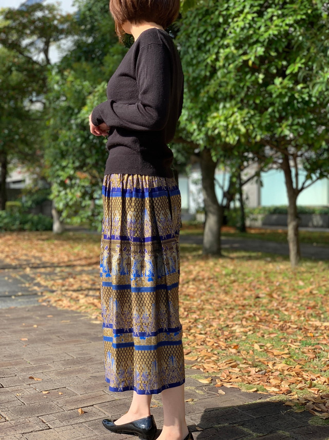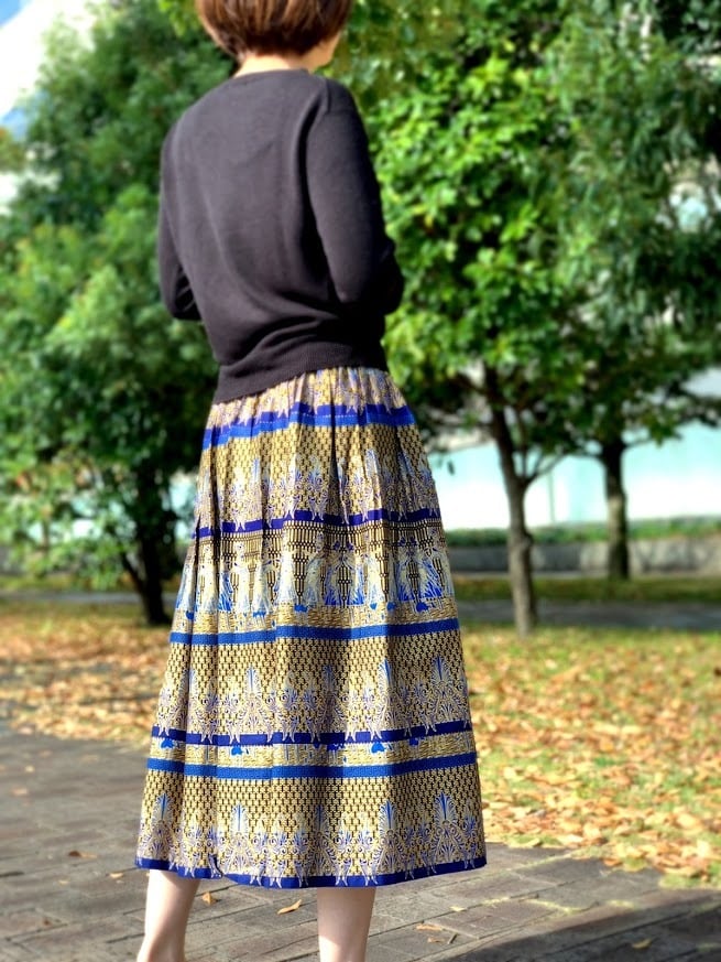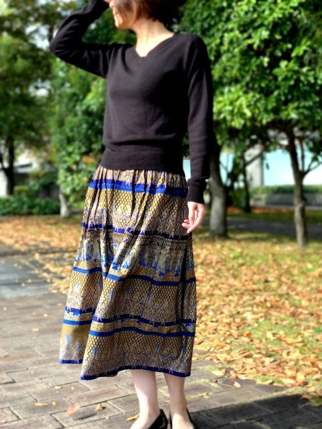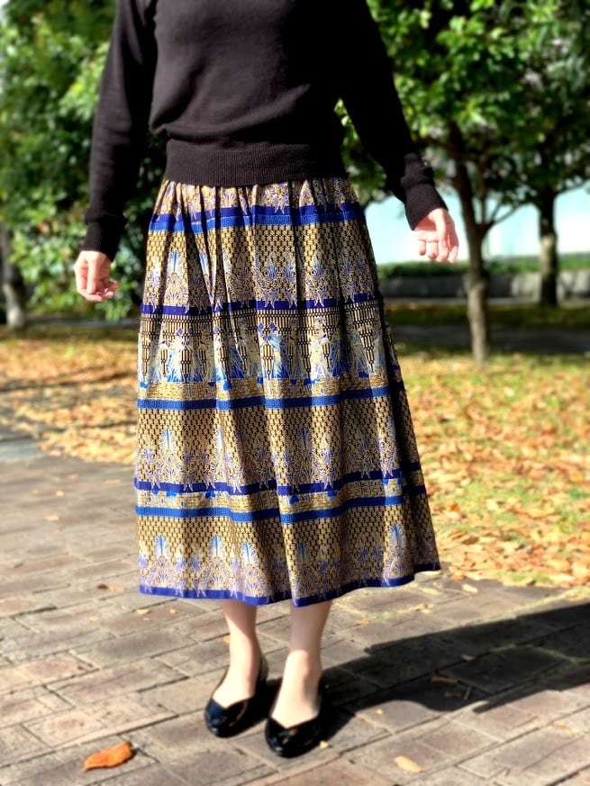 無地のトップスと合わせると、スカートの鮮やかな柄と色が