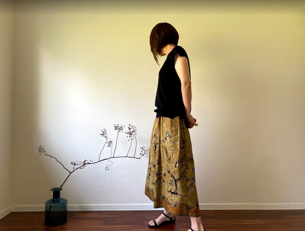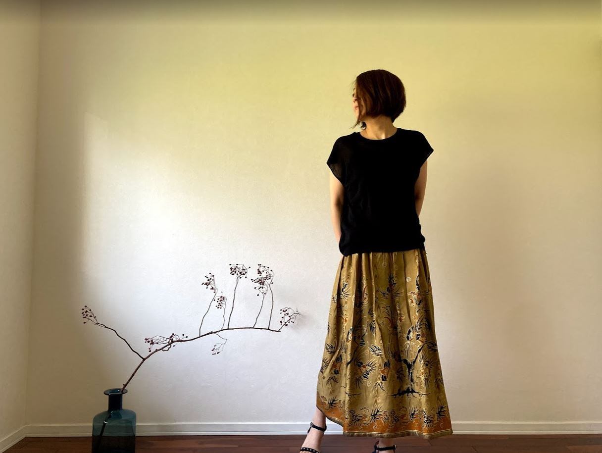 無地のトップスと合わせると、スカートの鮮やかな柄と色が